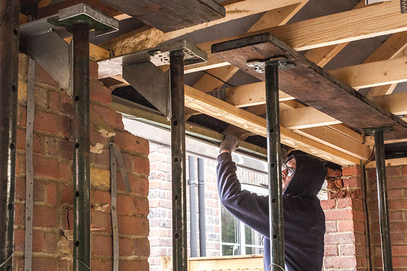 Before any structural alterations, we temporarily support the roof and walls to ensure stability during the conversion process.